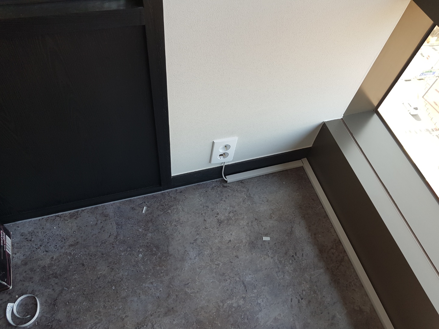 바닥 시스템단자에 랜선을 연결하고, 벽 가장자리를 빌둘러서 포설작업을 했습니다.