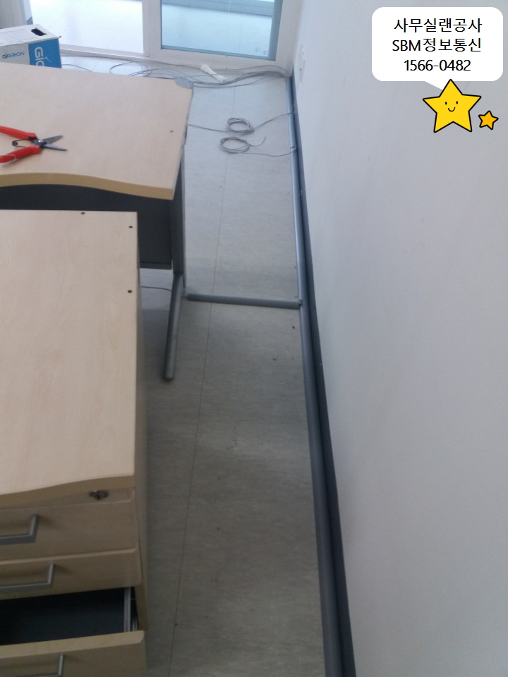 사무실이 벽 가장자리를 통해 랜선을 포설하고, 랜선을 보호하기 위해 몰딩으로 마무리해드렸습니다~