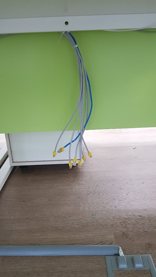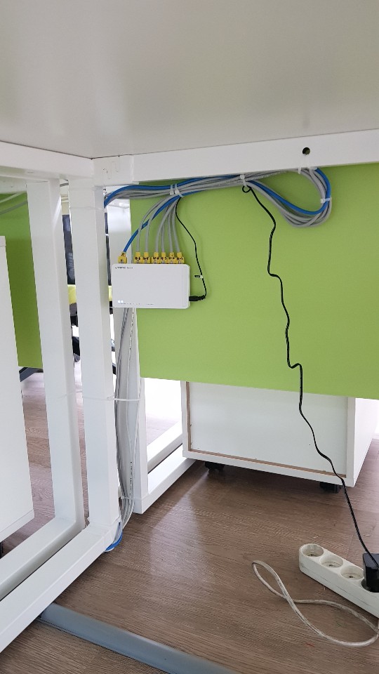 이제 사무실 중앙에 위치한 책상 아래 허브를 설치하고, 랜선들도 연결했습니다.