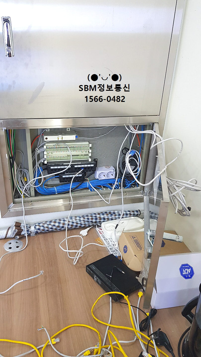 먼저 사무실 세대단자함에서 공유기와 허브를 장착하고, 벽과 바닥에 있는 통신포트를 연결하는 작업을 했습니다.