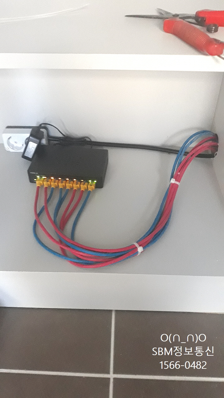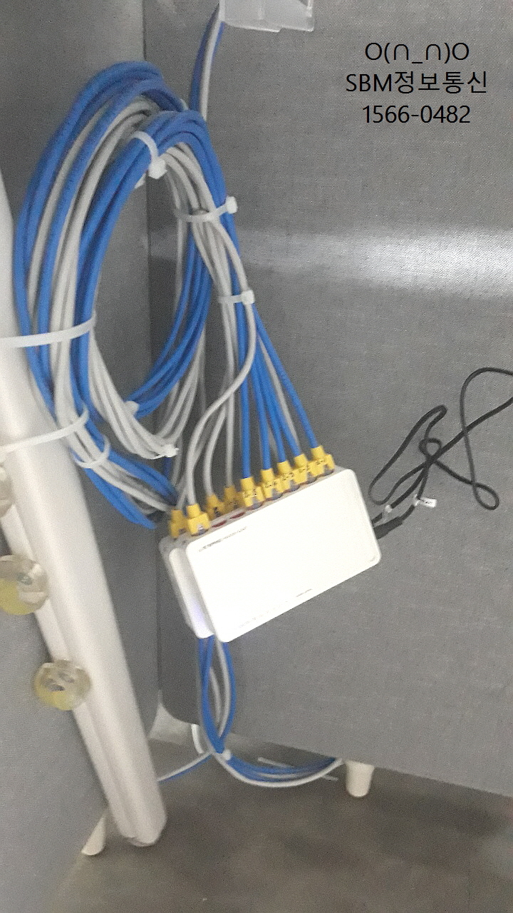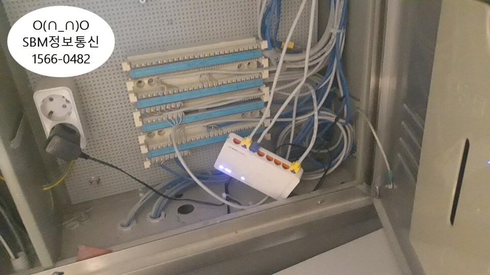 메인 공유기와 8포트 허브를 세대단자함에 놓고 랜선들을 모두 연결해서 케이블 타이로 깔끔하게 정리래드린 모습니다. 그뿐만 아니라 단자함 외부로 나가는 랜선들도 외부의 충격으로 단선되지 않도록 몰드로 막아드렸고요~