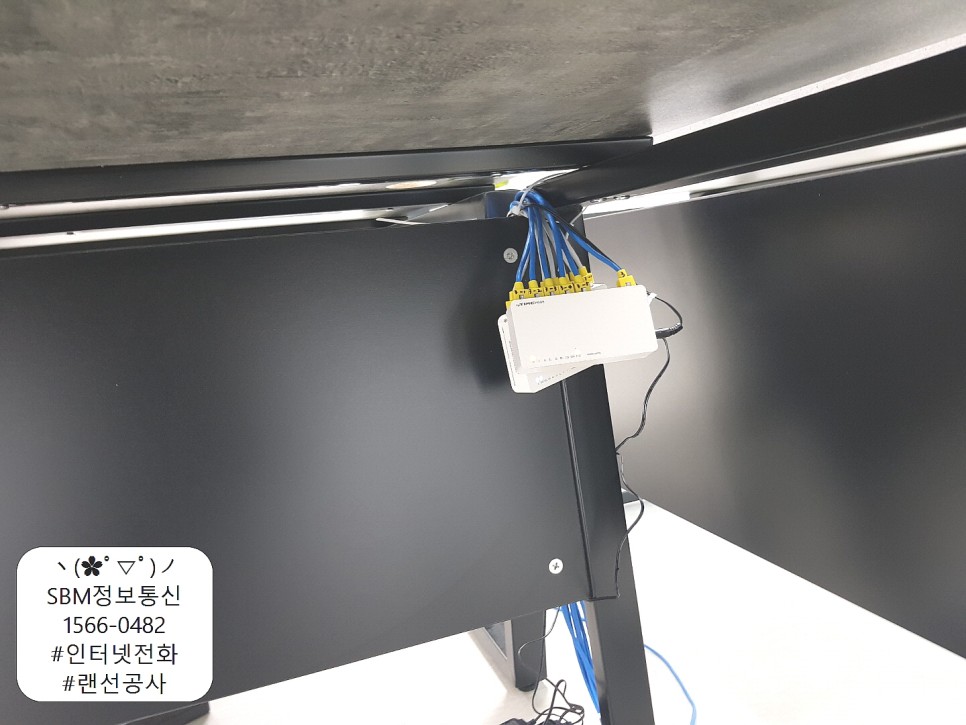 책상 아래로 랜선 포설 및 마무리를 짓고 사무실 중앙 책상 아래로 허브들을 물려서 관리가 용이하도록 해드렸습니다.