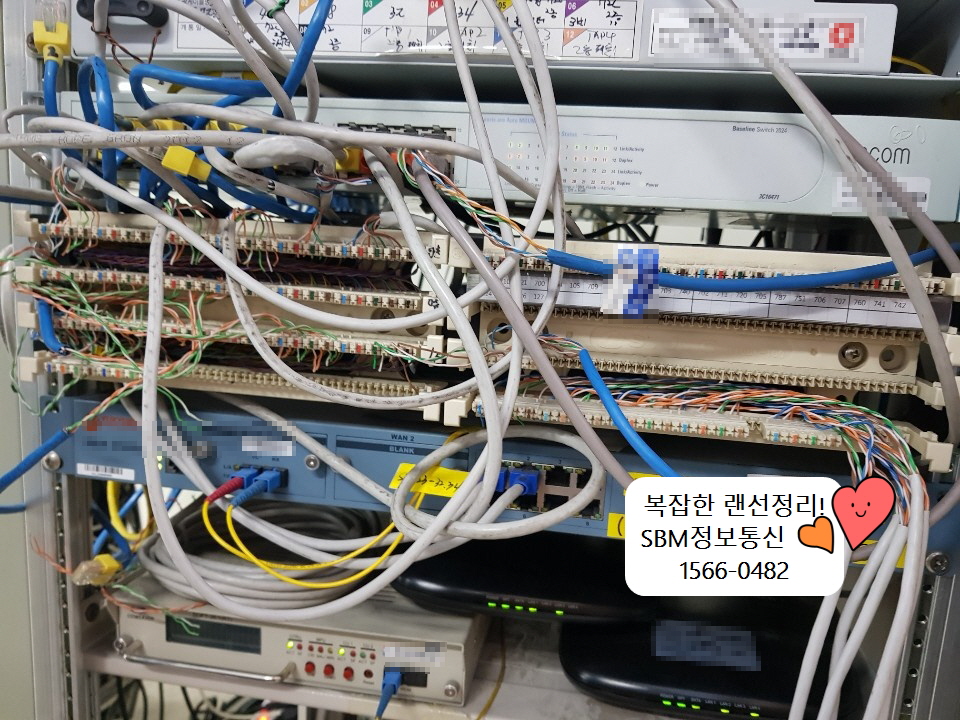 하지만 운용하시면서 장비도 하나둘 늘어나고 직원분들의 자리도 이동함에 따라 이렇게 어지럽게 되셨을 거라 추측이 됩니다. 랜선들이 이렇게 복잡하게 꼬인 가운데.. 계속 운용하시다가 혹여나 급작스럽게 장애라도 나면.. 어디가 어디인지 손쓰기 힘들어서 장애시간이 길어질 수 있습니다..