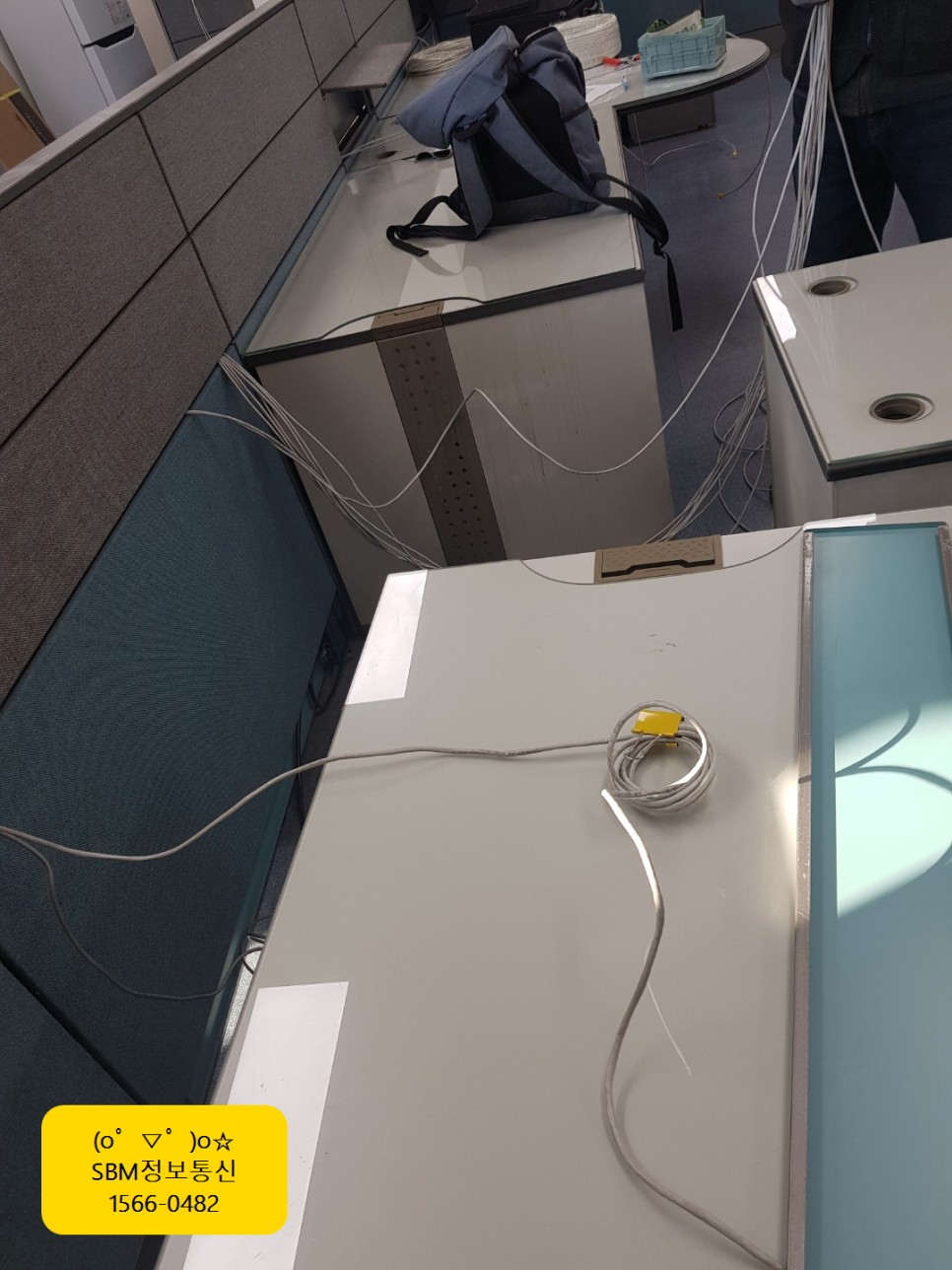 책상과 파티션으로 새롭게 설치하는 랜선과 전화선 들의 모습입니다~