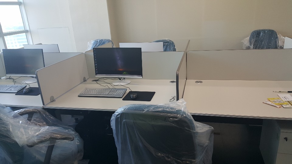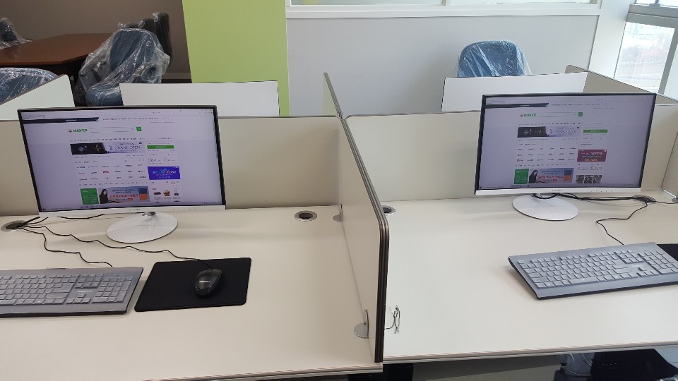 모니터와 PC 본채를 꺼내서 각 책상별로 이동해서 연결한 모습니다.