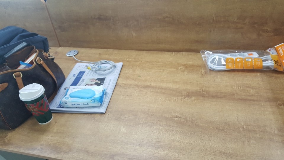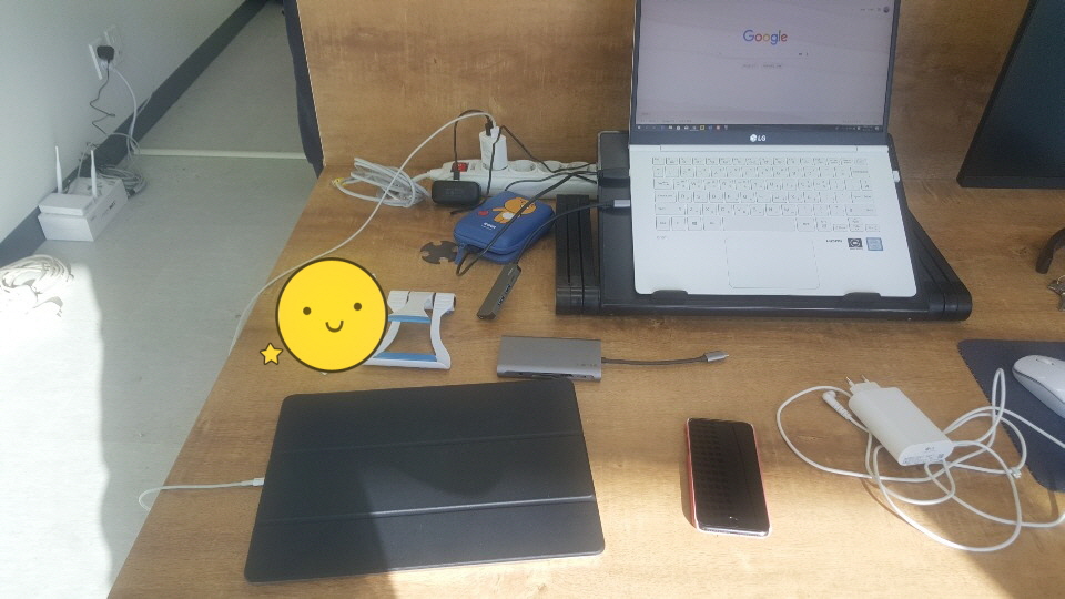 바닥에 있는 랜선을 책상 위로 올리고, 멀티탭도 새로 설치하고 있는 중에 한 컷입니다~ ^^
