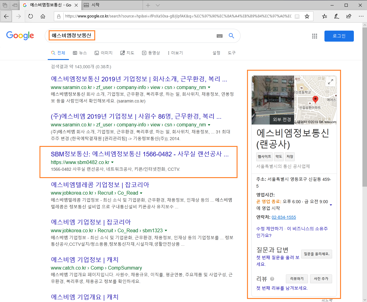 저희 에스비엠정보통신은 현장에서 작업이 마치면 테스트로 자사 상호를 검색해봅니다.