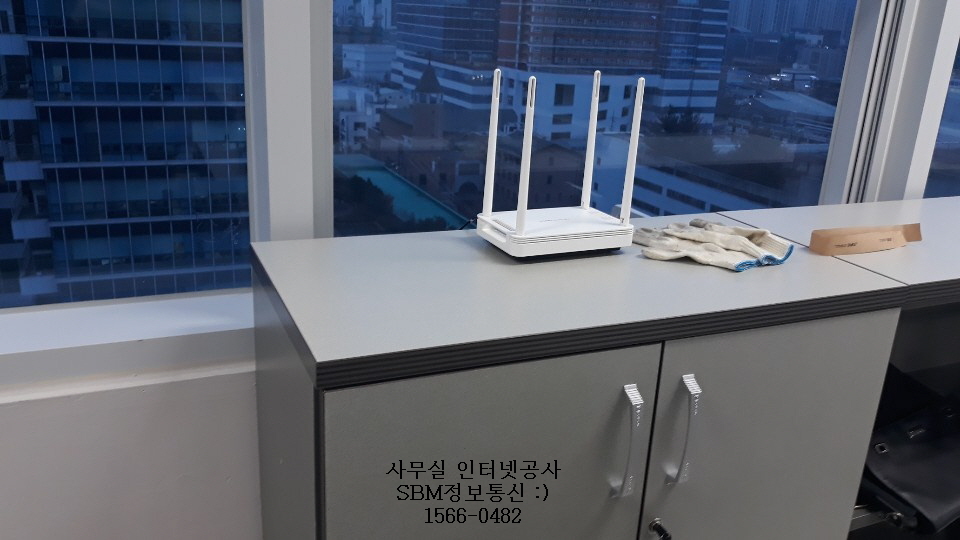 사무실 창쪽 선반 위로 메인 공유기를 설치했습니다.