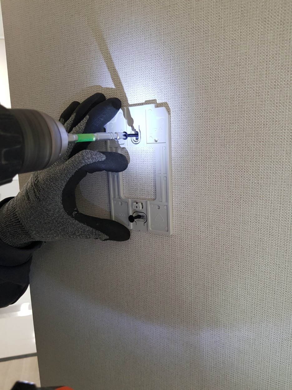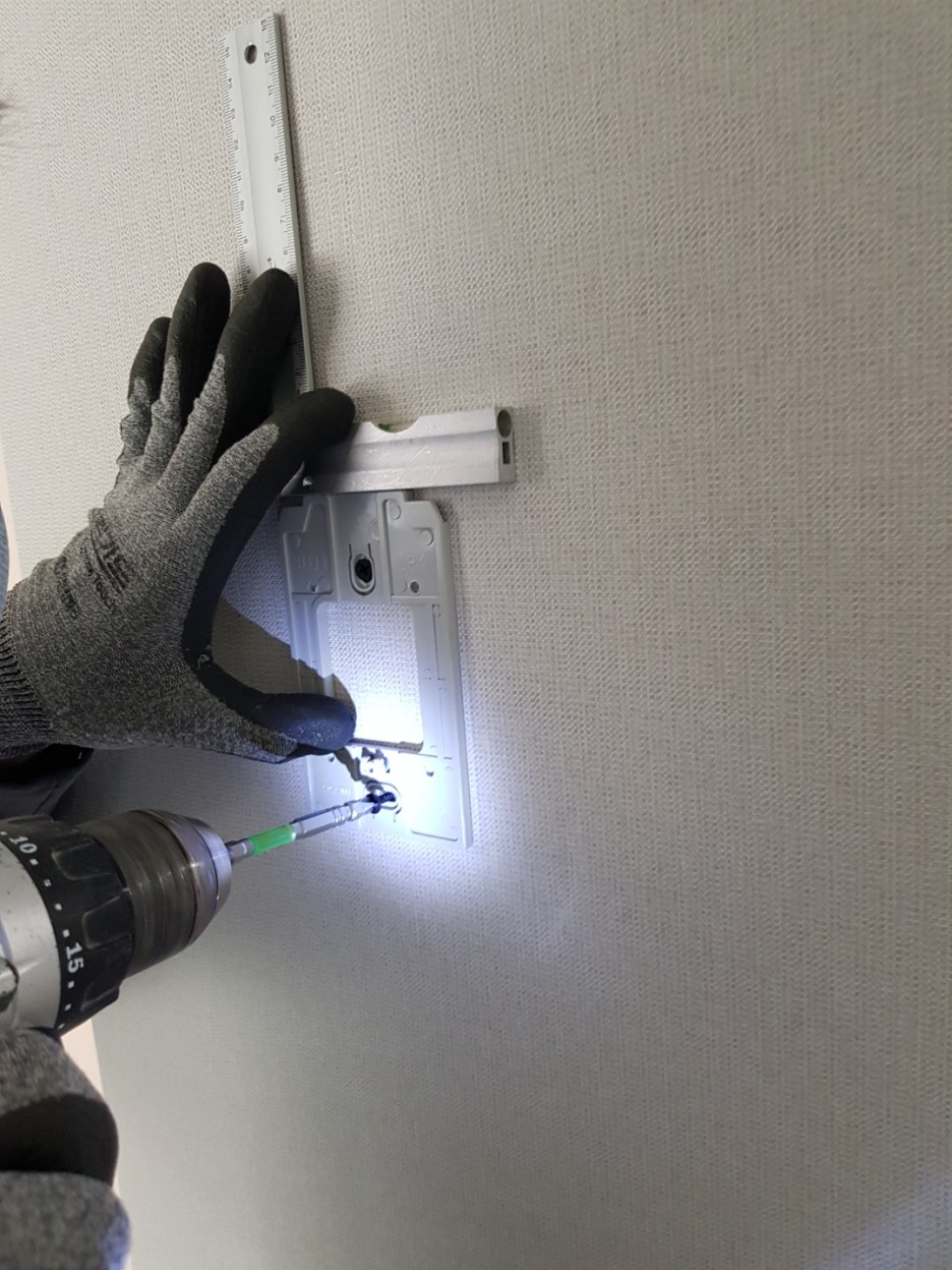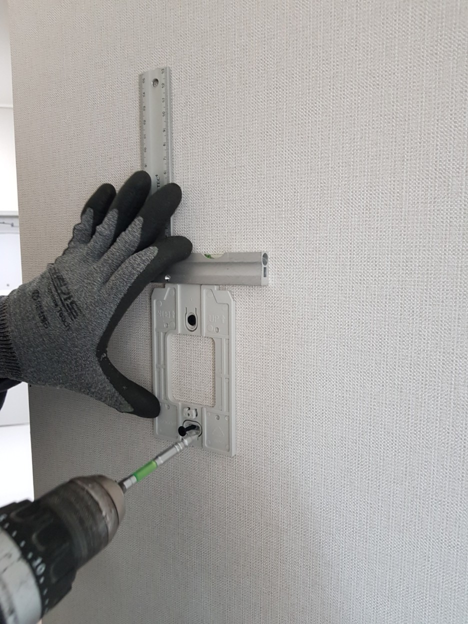 사진은 벽에 구멍을 내고 브라켓을 연결하는 모습입니다.