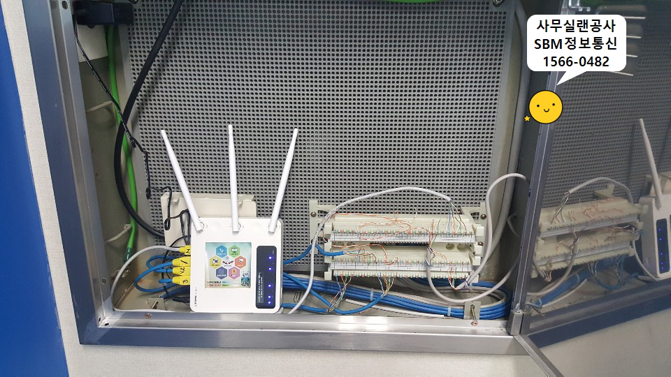 공유기에 붙인 저희 스티커엔 저희 에스비엠정보통신이